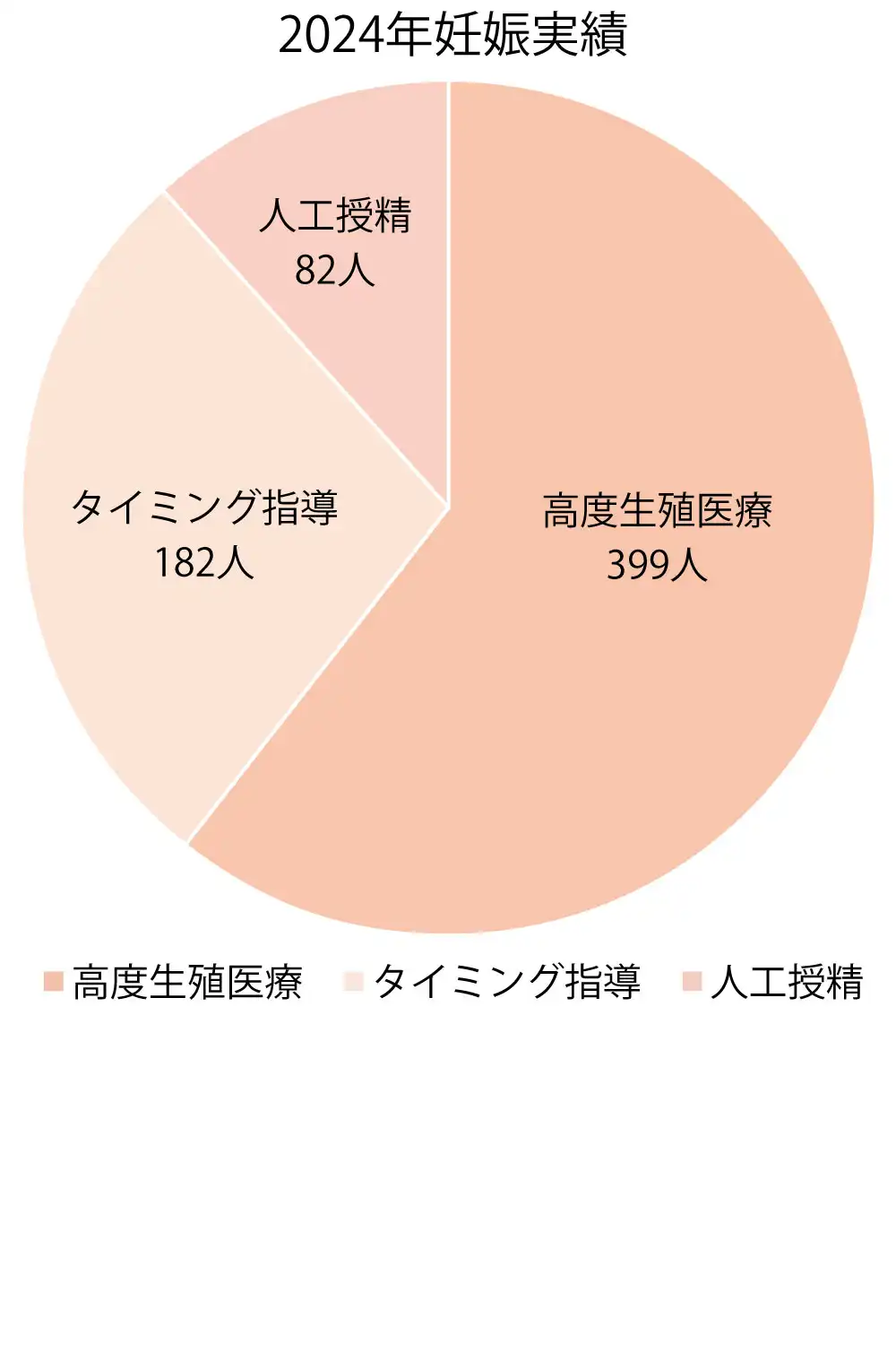 2024年の妊娠実績は、タイミング指導182名、人工授精82名、高度生殖医療399名です。